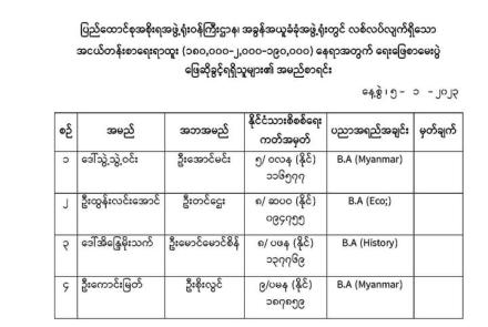 - အငယ်တန်းစာရေးရာထူးနေရာအတွက် ရေးဖြေစာမေးပွဲဖြေဆိုခွင့်ရရှိသူများ၏ အမည်စာရင်း