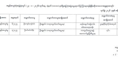 - အခွန်အယူခံခုံအဖွဲ့ရုံးတွင် ၃၀-၃-၂၀၂၂ ရက်နေ့၊ နံနက်(၁၀:၀၀)နာရီအချိန်တွင် ဗီဒီယိုဆက်သွယ်မှု (Video Conferencing)ဖြင့် ကြားနာရန်ချိန်းဆိုထားသော အမှုများစာရင်း